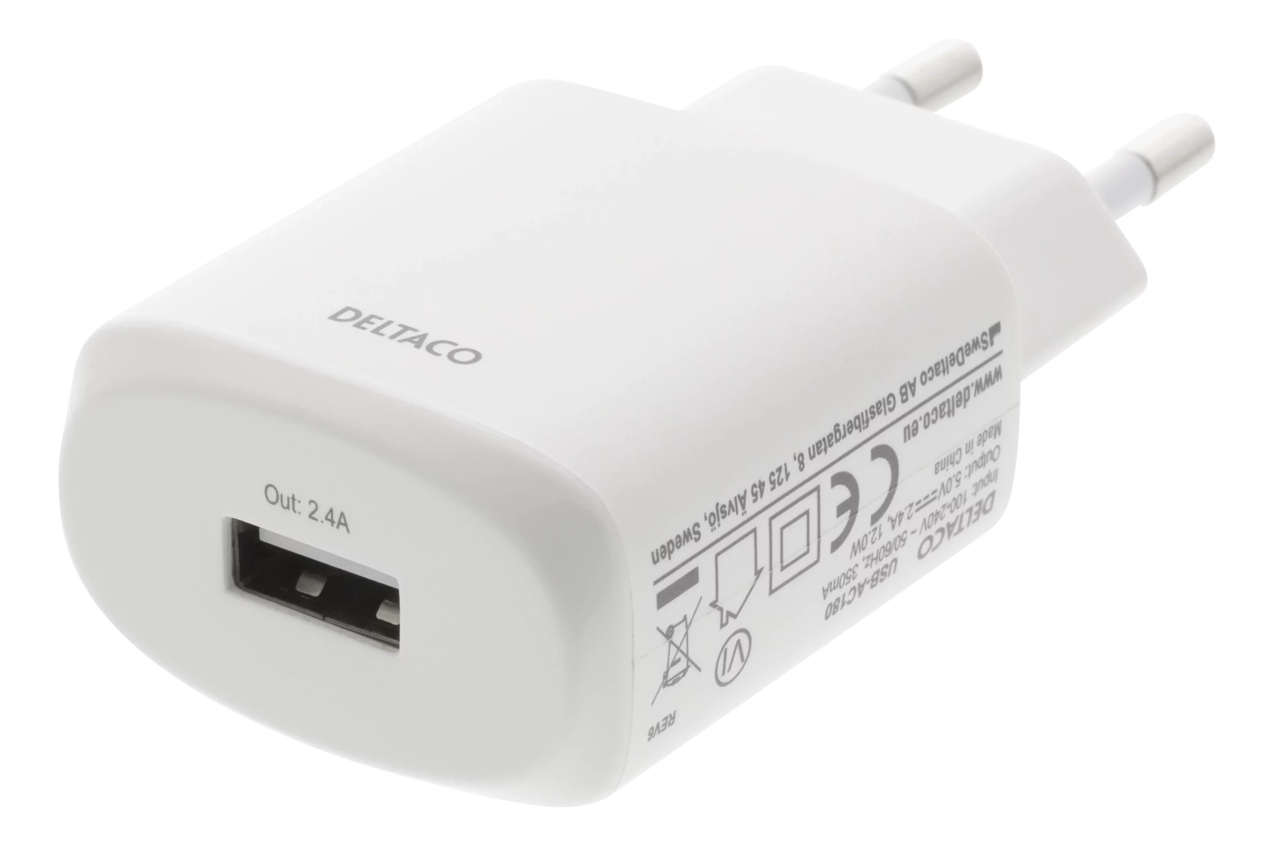 En vit laddare med uttag av USB-A. Laddar med 2,4A vilket är snabbt.